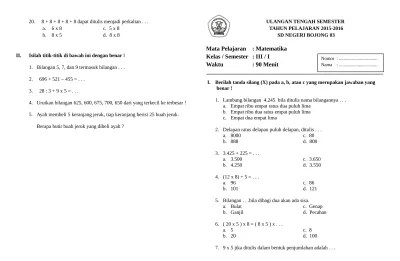 Contoh soal ukk, pat matematika kelas 1 semester 2 sd.